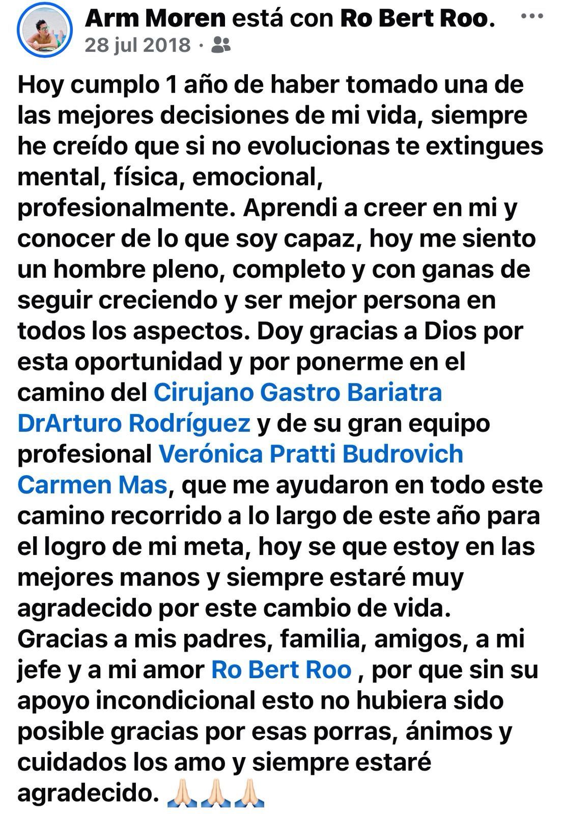 "Fueron tantos cambios en mi vida, siempre me ha gustado comer bien, solo que he aprendido a ingerir solo las cantidades que requiere mi organismo y no me produce ansiedad la comida. Siento que tengo nuevas oportunidades en mi vida personal, laboral y en general tengo más seguridad en mi persona"